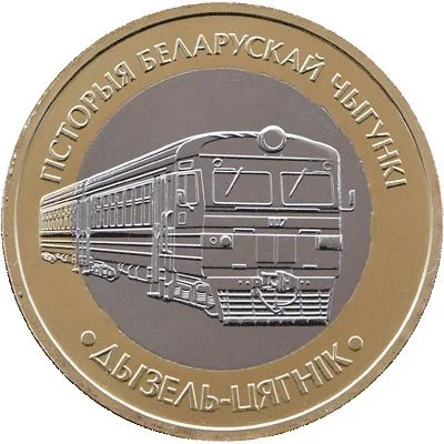 Description: A steam locomotive is centered within a circle. Around the top is "HISTORY OF BELARUSIAN RAILWAYS" and around the bottom, "DIESEL TRAIN."