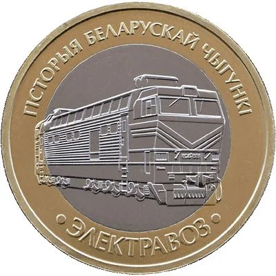 Description: A steam locomotive is centered within a circle. Around the top it reads "HISTORY OF BELARUSIAN RAILWAYS" and around the bottom, "ELECTRIC LOCOMOTIVE".