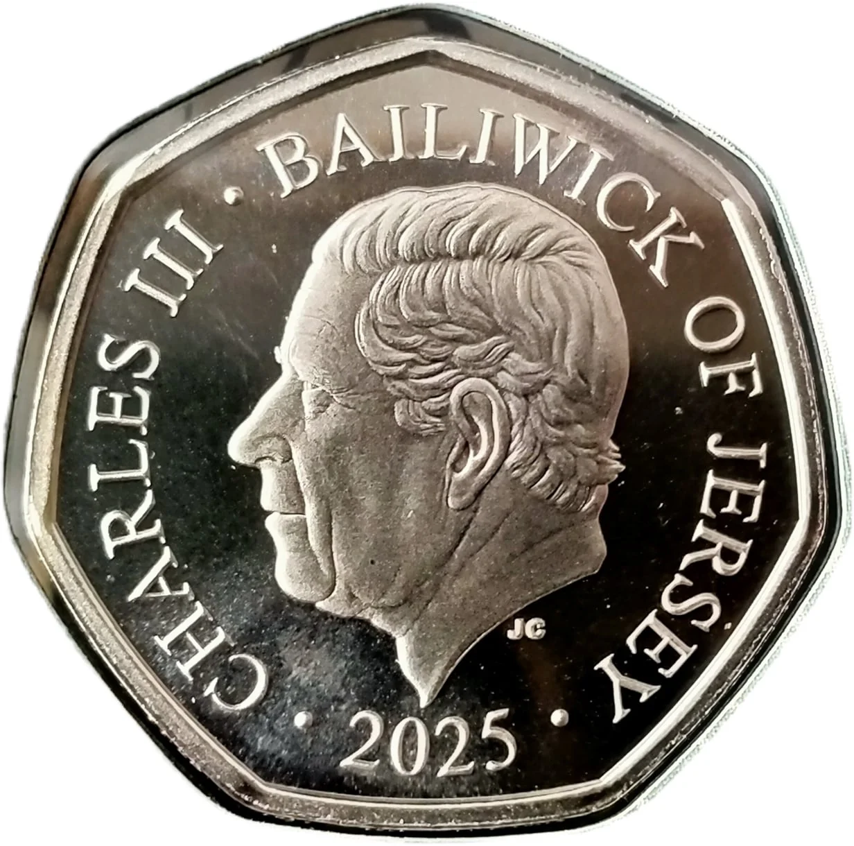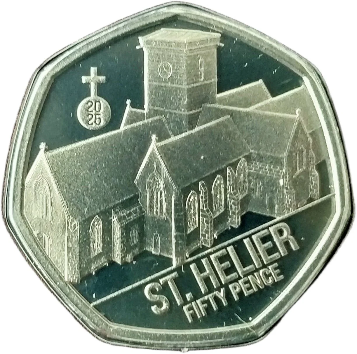 The 2025 coin features the Town Church of St. Helier, marked with an orb and cross.