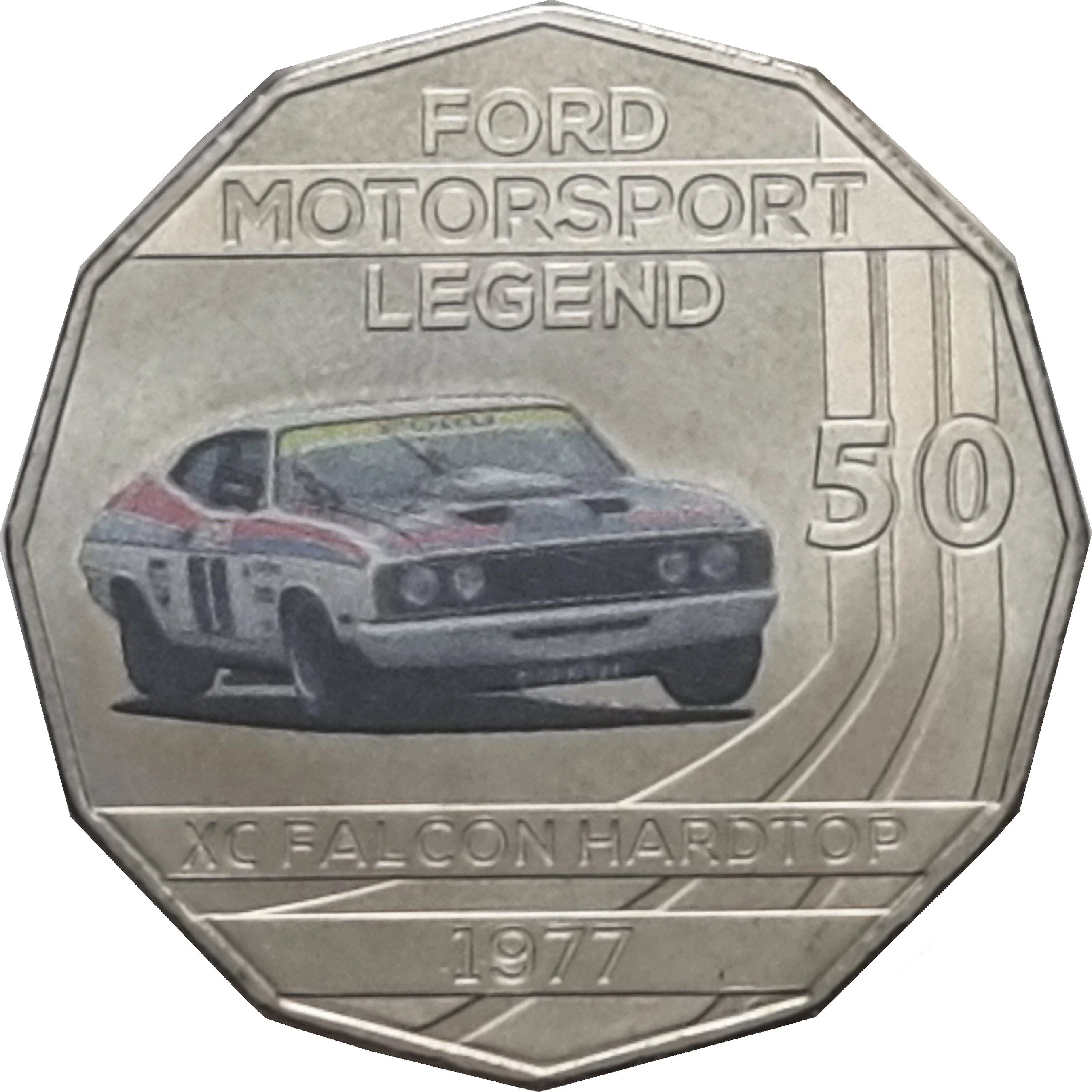 1977 Ford Falcon Hardtop pad printed in white with red and blue stripes. Text above and below; denomination overlaid on racing lines at right.