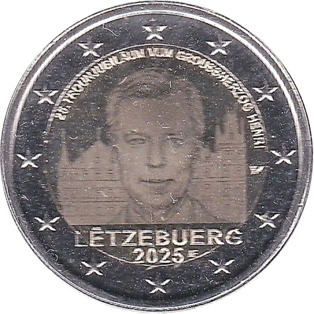 Portrait of Grand Duke Henri before the Grand Ducal Palace. Above, "25. TROUNJUBILÄUM VUM GROUSSHERZOG HENRI" arches at the top. Below are "LËTZEBUERG", the initials "MF", and "2025". The outer ring features the twelve stars of the European flag.