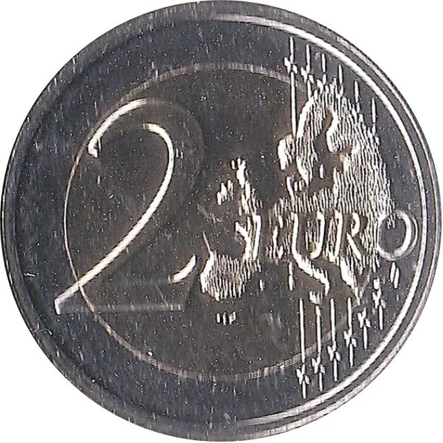 A Western Europe map spans the coin's right side, with "2 EURO" overlaid—the "2" in the Atlantic. Twelve stars flank the map, six above and six below, connected by six vertical stripes across the inner core.