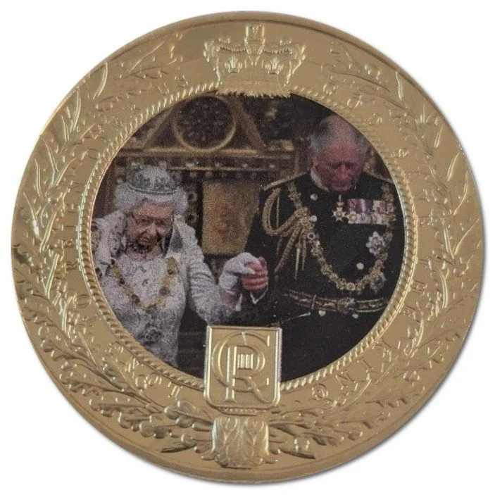Prince Charles with Queen Elizabeth II at Parliament's opening. Crown above, wreath and legend encircling, king's monogram below.