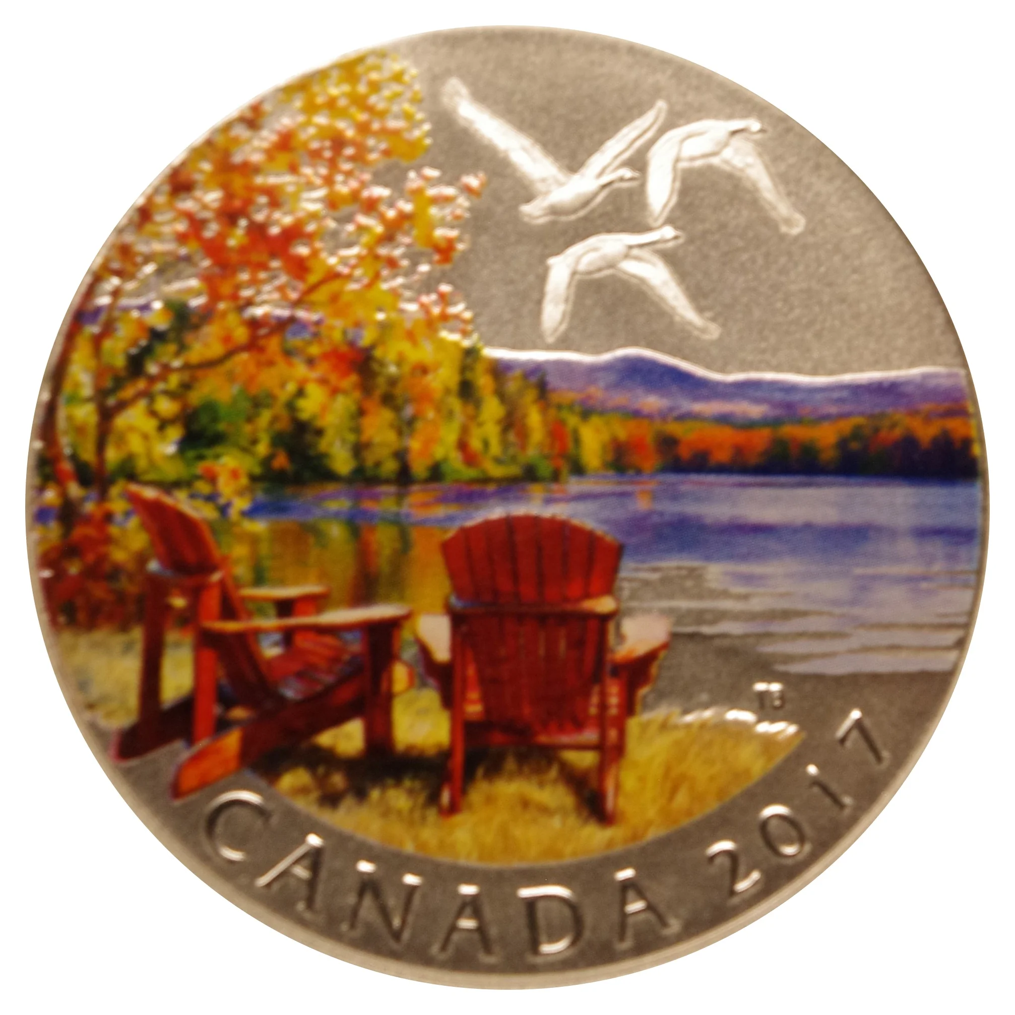 Three geese fly over a lake, with two Adirondack chairs and a colorful autumn tree to the left.