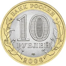 The face value "10 РУБЛЕЙ" is in the centre. Inside the "0", the number "10" and "РУБ" appear alternately when tilted. The mint mark is below. Around the ring, the top reads "БАНК РОССИИ", the bottom has the year "2006", and stylized plant branches extend from the sides onto the disc.