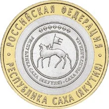 The coat of arms of the Republic of Sakha (Yakutia). The rim is inscribed with "РОССИЙСКАЯ ФЕДЕРАЦИЯ" at the top and "РЕСПУБЛИКА САХА (ЯКУТИЯ)" at the bottom.