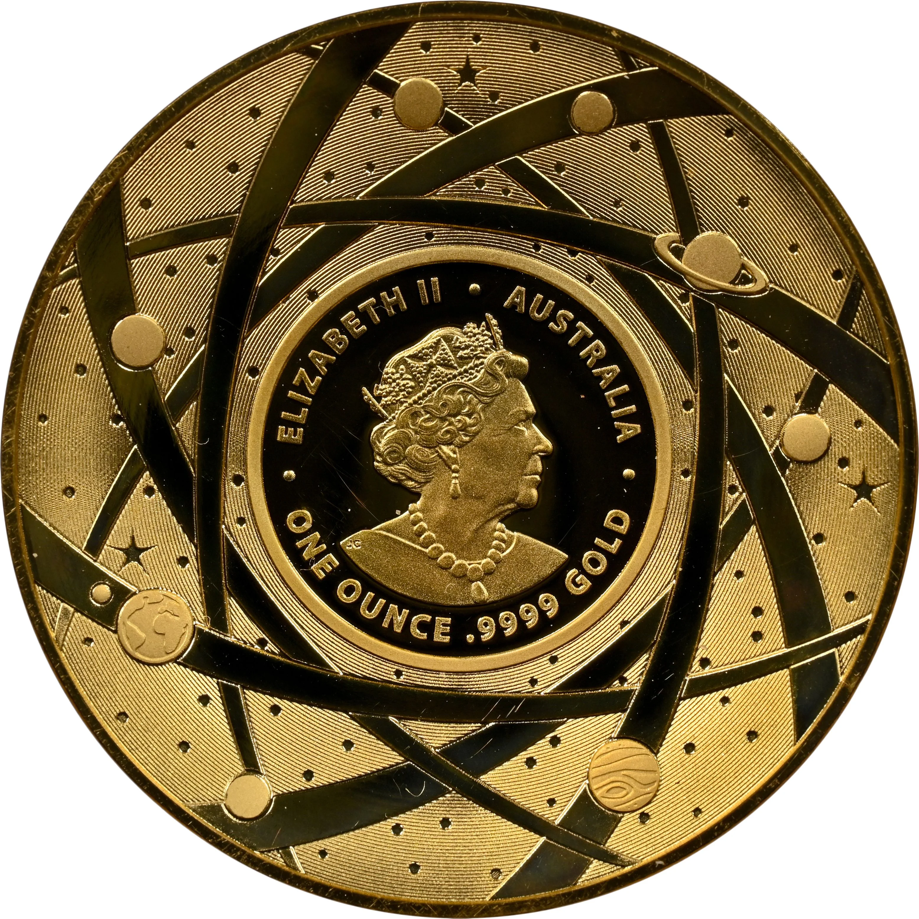 Concave 6th portrait of Queen Elizabeth II facing right, wearing the State Diadem and Coronation Necklace, with weight below and planets encircling.