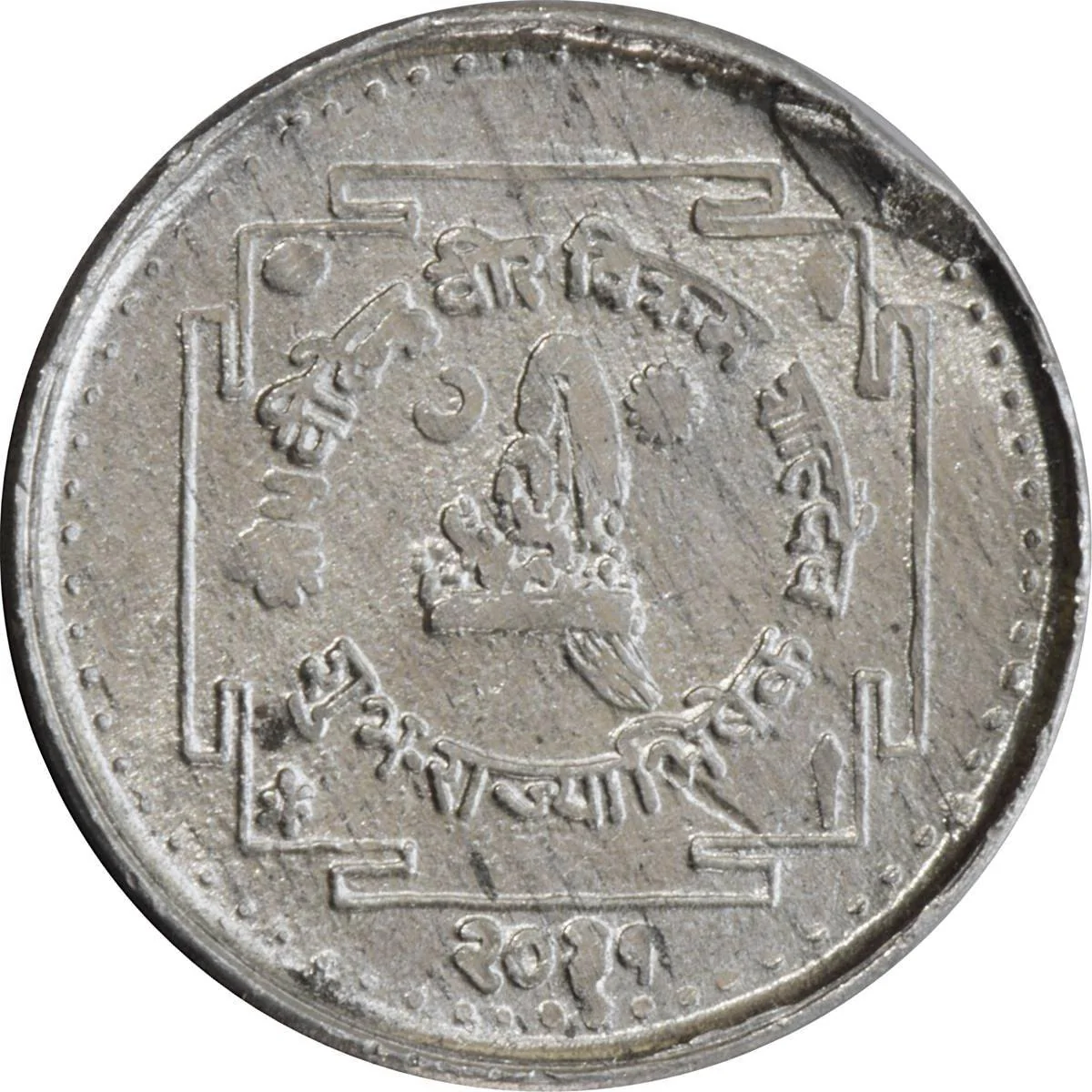Crown encircled, Devnagari legend: "Shree Pach Birendra Bikram Shah Deva Shub Rajyabhishek 2031."