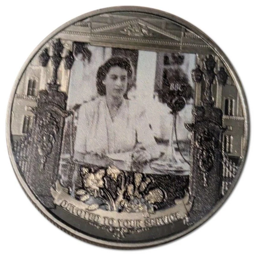 Princess Elizabeth's 1947 pledge of lifelong service in a radio broadcast, framed by Buckingham Palace gates and a floral bouquet with an inscribed ribbon.