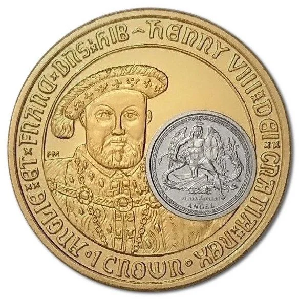 Bust of Henry VIII, inlaid with a 1/20 angel coin on the right.
