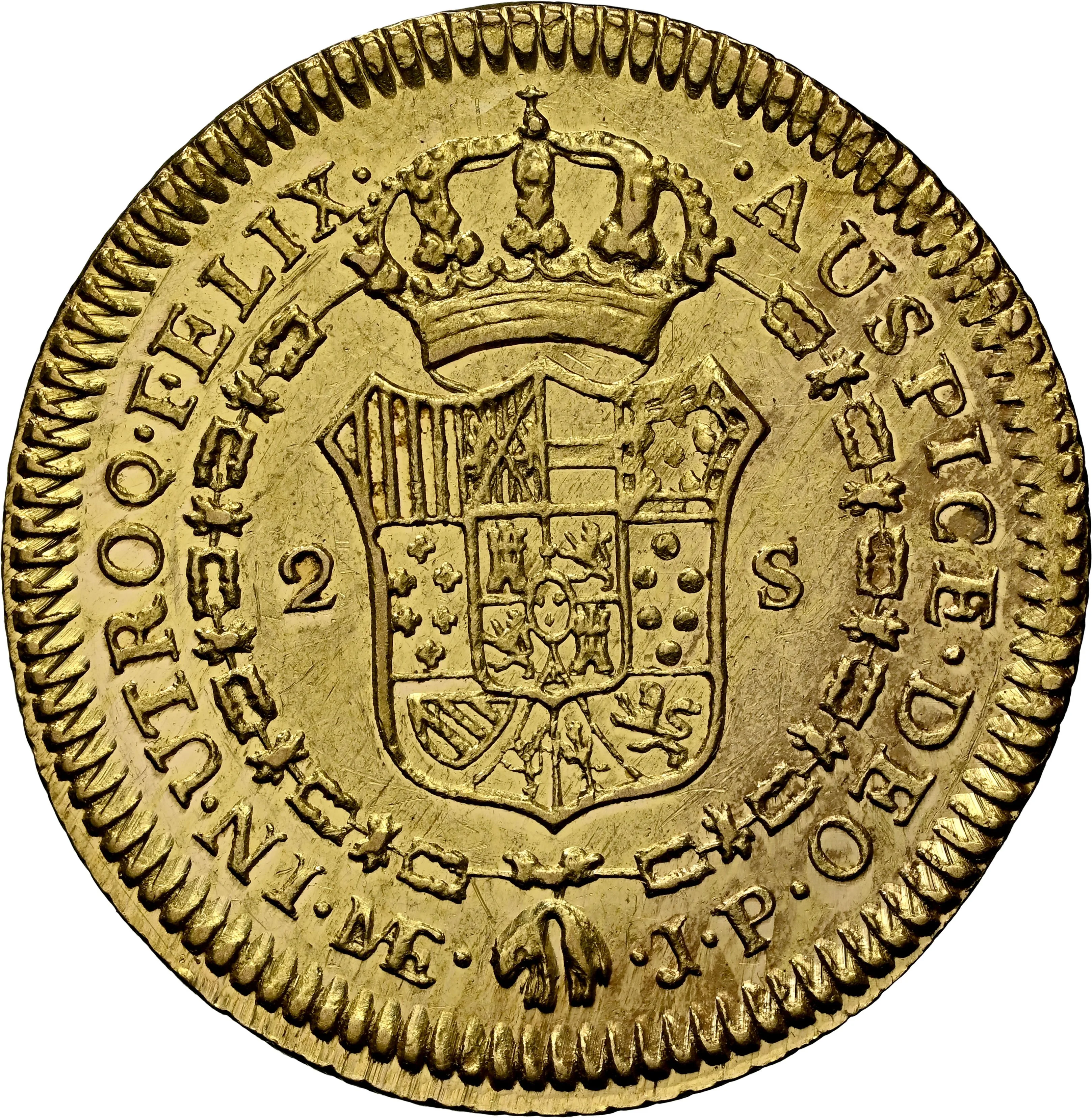 Crowned Spanish coat of arms divides face value; stylized chain and inscription surround; mintmark and assayer initials below.