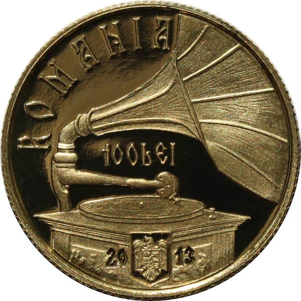 A gramophone, representing Maria Tănase's first albums, with "ROMANIA," "100 LEI," the coat of arms, and "2013."