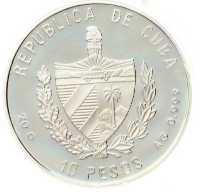 Cuban coat of arms with country name above, face value below, and weight and fineness on the sides.