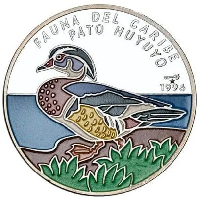 Wood duck (Pato huyuyo) design with series and animal names above, year and mintmark at right.
