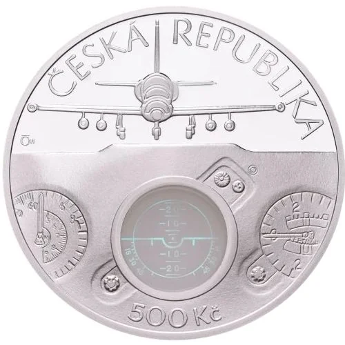 The coin's obverse depicts an Aero L-39 jet above a dividing line, below which is an instrument panel. The central artificial horizon instrument is on a round plastic plate embedded in the coin. "ČESKÁ REPUBLIKA" arches along the top, while "500 Kč" and the Czech Mint mark "ČM" are near the bottom.