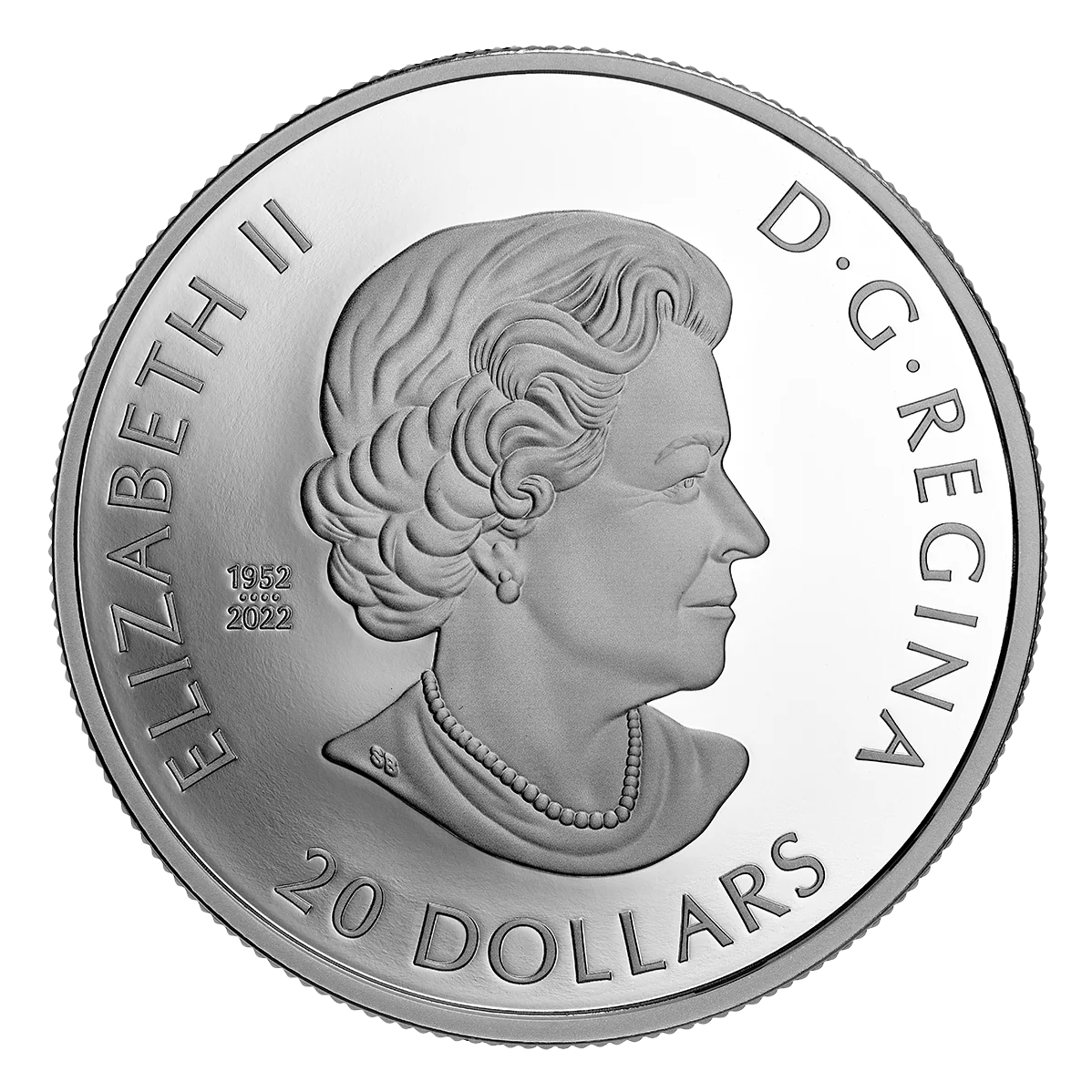 Queen Elizabeth II facing right, with four pearls representing the queens on Canadian coins.
