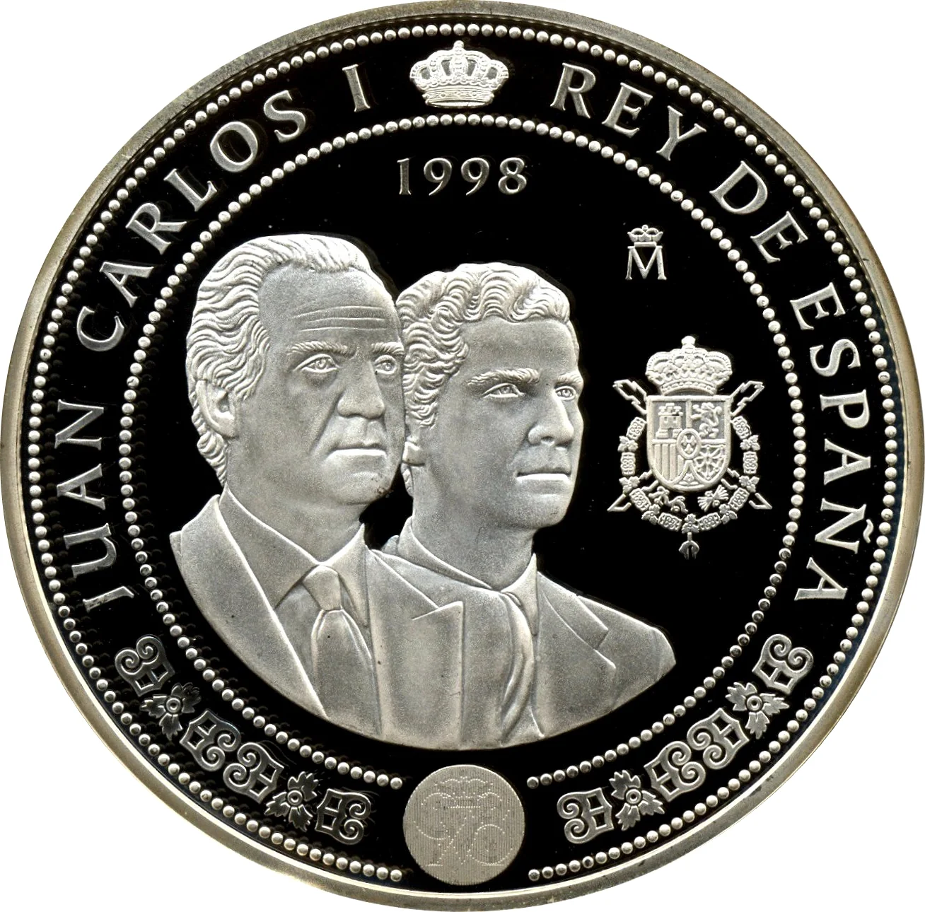 Conjoined busts of Juan Carlos I and Prince Felipe left, with Juan Carlos's coat of arms and a crowned latent image.