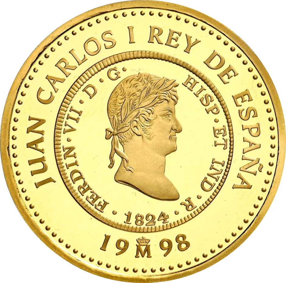 Bolivia 1824 8 Escudos coin, featuring King Fernando VII (obverse).