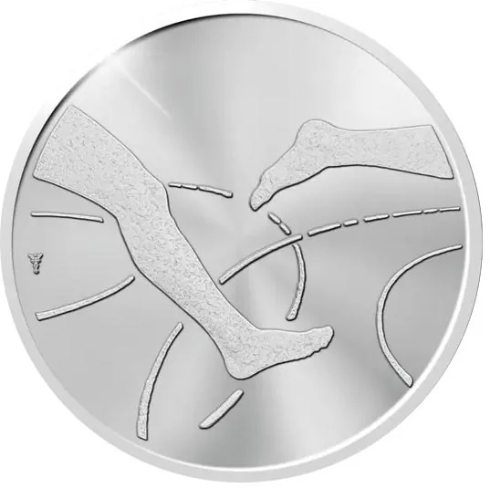The obverse depicts two legs in motion against intersecting lines, symbolizing the competition between Finland and Sweden.
