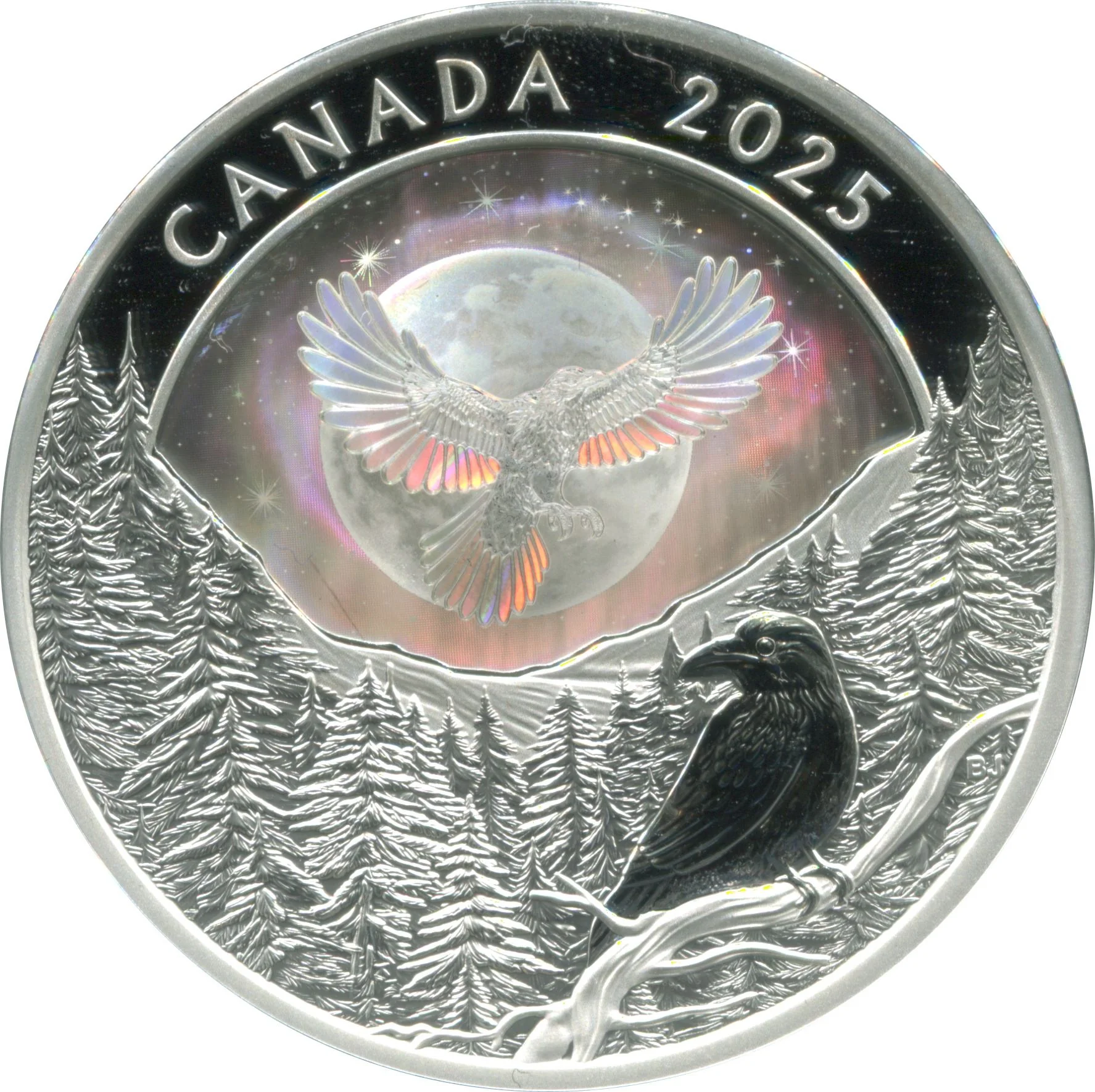 Two ravens. Top: a hologram-enhanced bird flies before a full moon and aurora. Bottom: a second perches on a forest branch. Signature BJ.
