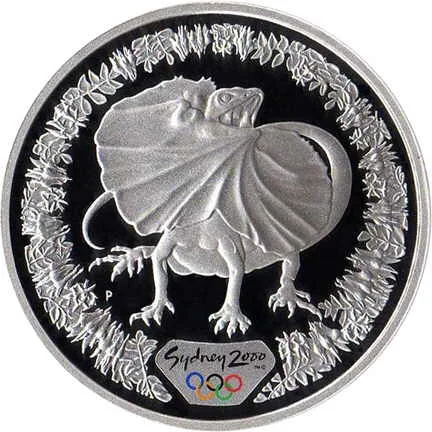 Frill-necked lizard in wreath, colored Olympic rings below.