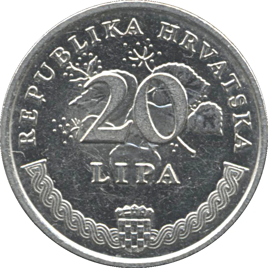A stylized linden branch with the value "20" on its leaves and the word "LIPA" below it is central. "REPUBLIKA HRVATSKA" arches above, while the Croatian coat of arms, flanked by old braided ornaments, is below.