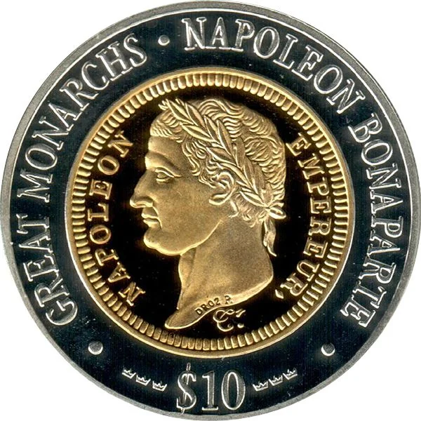 Napoleon Bonaparte bust left, gilt, from original Napoléon d'Or coin design, denomination below.