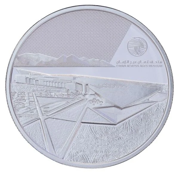Oman Across Ages Museum: its building, Hajar Mountains setting, logo, and intricate patterns.