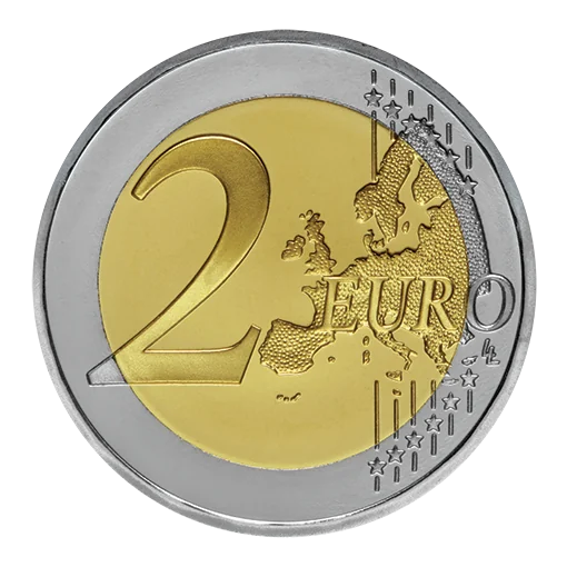 A Western Europe map spans the coin's right side, with "2 EURO" overlaid—the "2" in the Atlantic. Twelve stars flank the map, six above and six below, connected by six vertical stripes across the inner core.