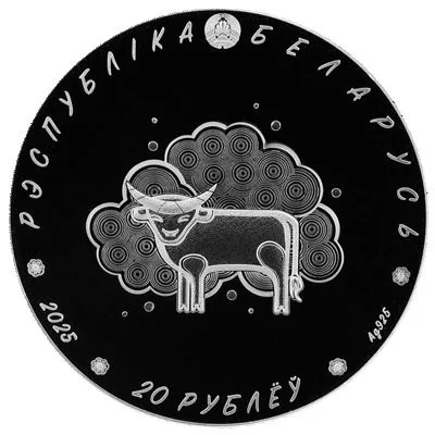 Description: Featuring the State Emblem and "REPUBLIC OF BELARUS" above, the center shows a stylized bull and sheep. Below is the 20 ROUBLES denomination, flanked by the alloy standard and minting year.