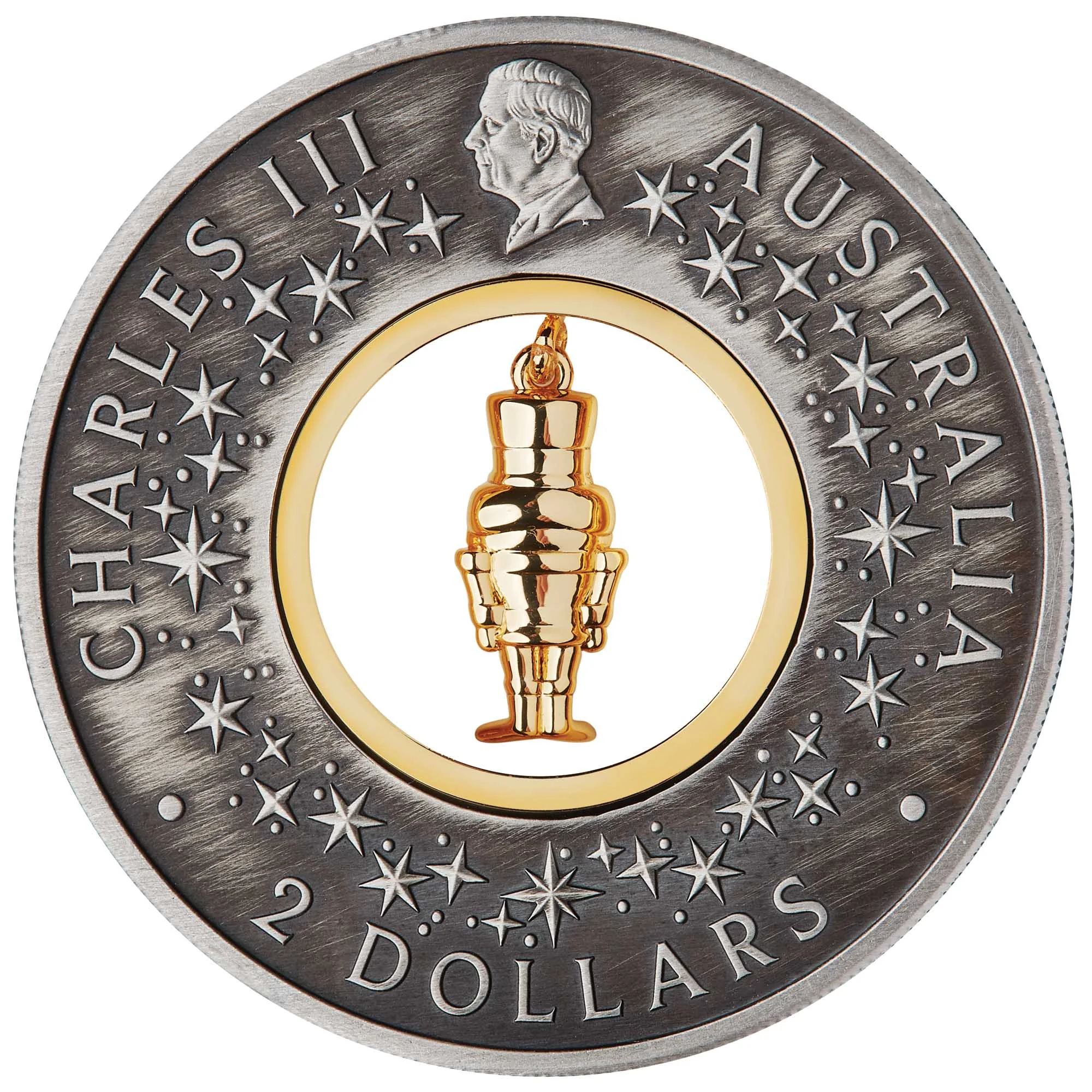 Miniature portrait of King Charles III facing left, surrounded by a star-patterned nutcracker insert.