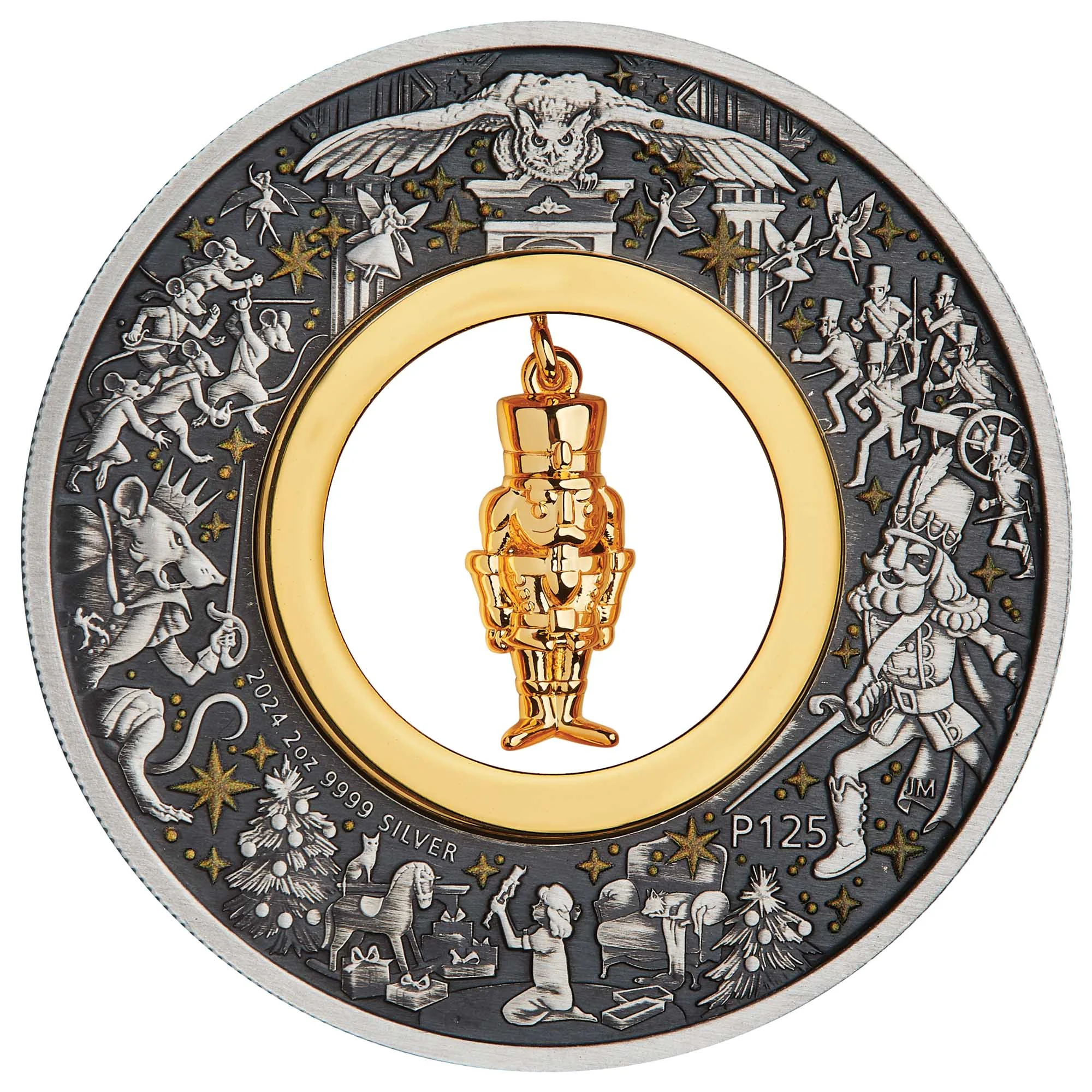 The Nutcracker, the Mouse King, a girl, fairies, Christmas trees, an owl, and golden stars.