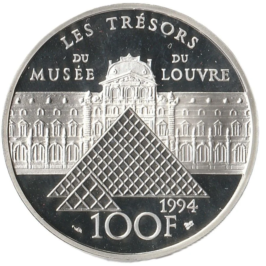 Vue du Louvre et de ses pyramides, avec la légende "LES TRESORS DU MUSÉE DU LOUVRE" et la valeur faciale.
