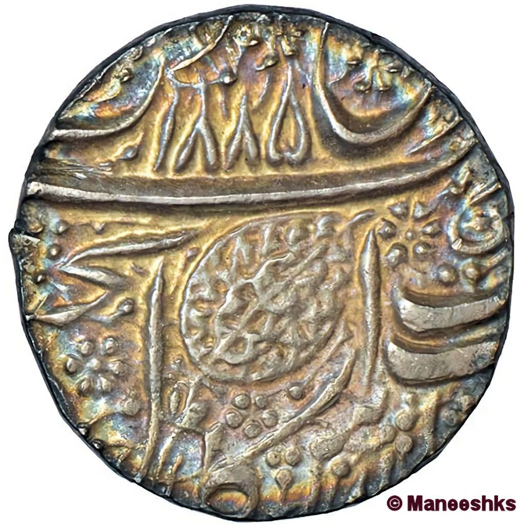 Nanakshahi couplet, variant V: six dots between 'Guru' and 'Gobind', comb symbol below 'Singh', moving VS year.