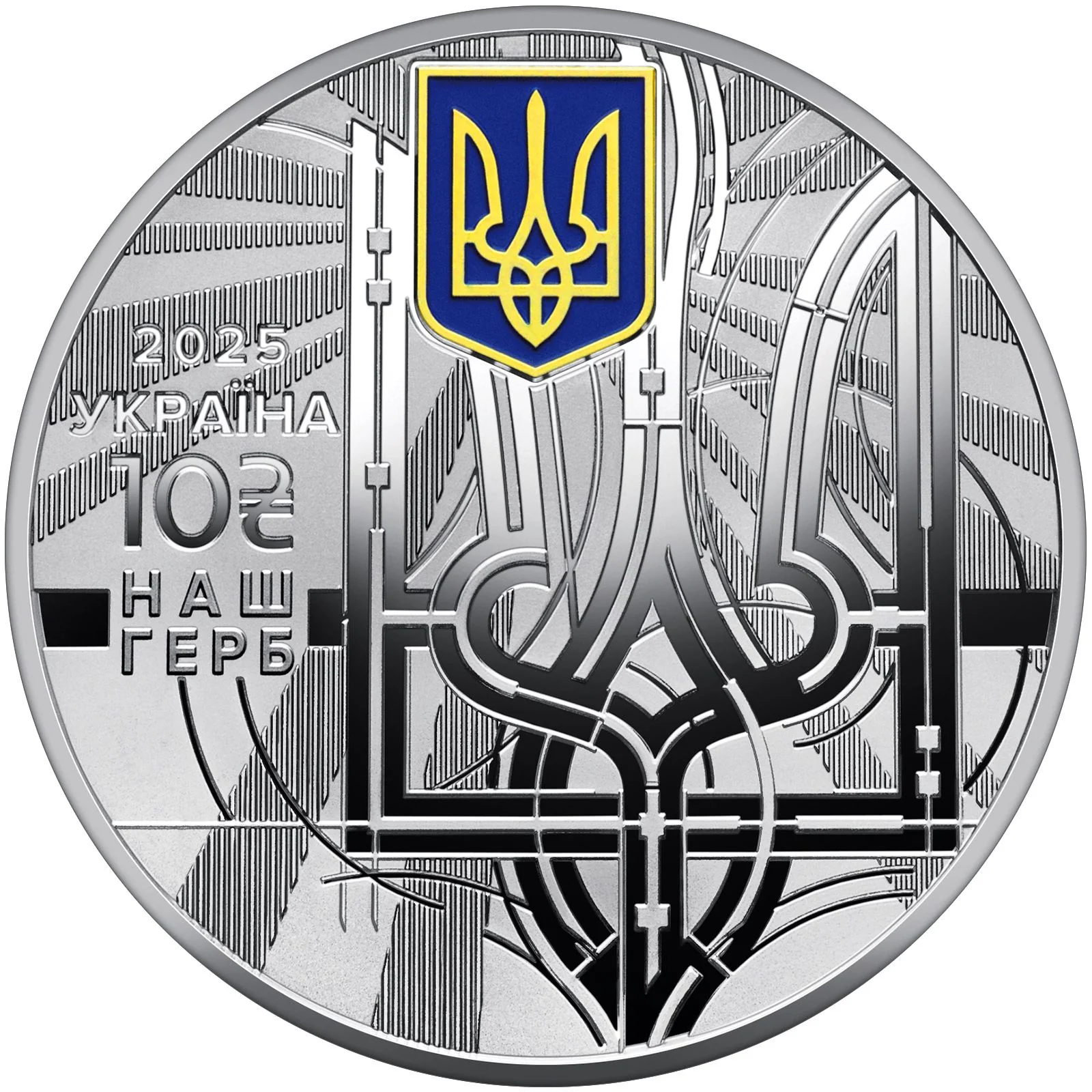 Ukraine’s coat of arms is a golden trident on a blue shield, set against sun rays and styled after the emblem of Volodymyr the Great.