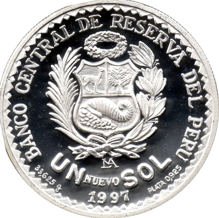 Peruvian coat of arms (vicuña, cinchona tree, cornucopia with coins) encircled by "BANCO CENTRAL DE RESERVA DEL PERU" and the date.