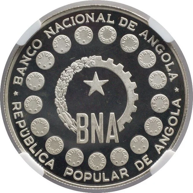 The National Bank of Angola emblem is centered, encircled by the names of the seventeen provinces. Around the edge, "National Bank of Angola" is above and "People's Republic of Angola" below, separated by five-pointed stars.