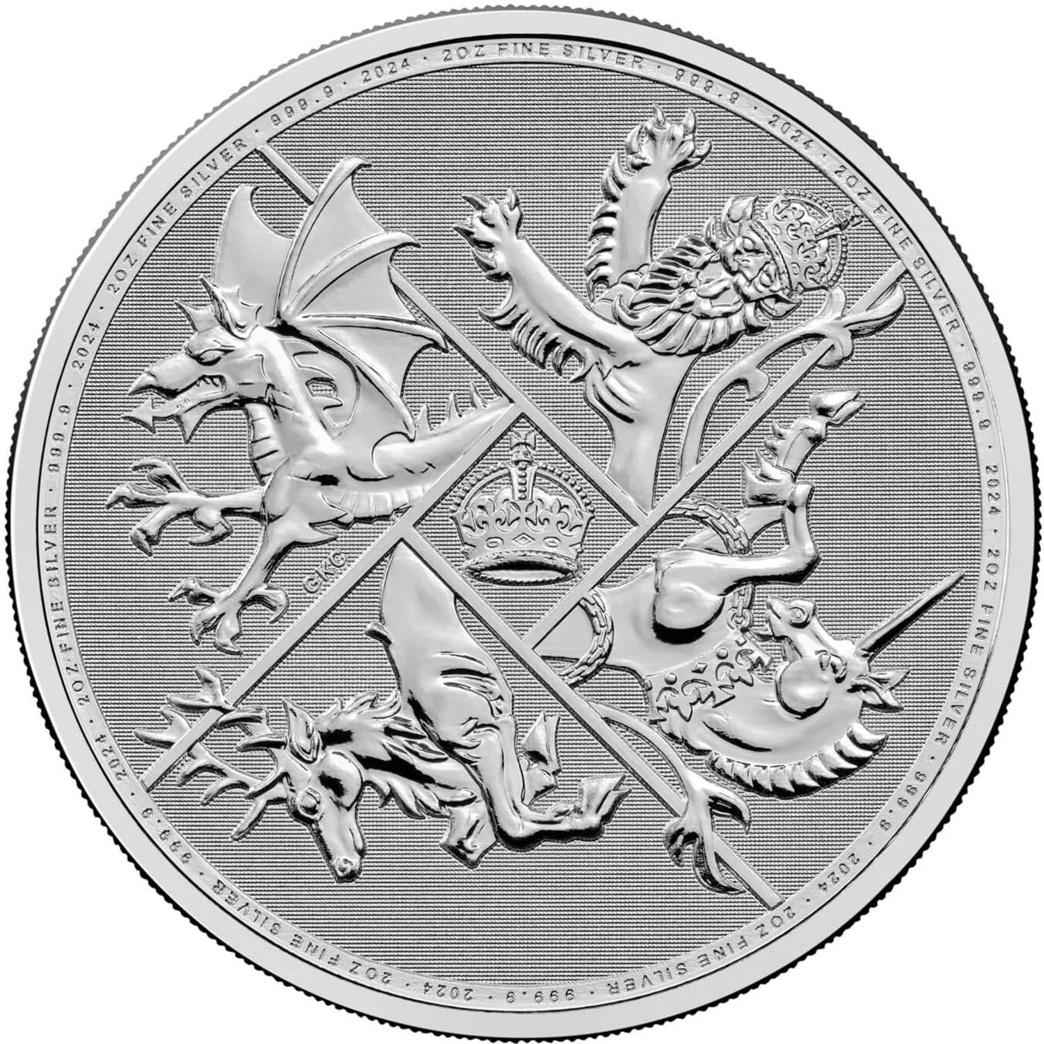 A crown encircled by the UK's four heraldic beasts: the English lion, Welsh dragon, Scottish stag, and Irish unicorn.