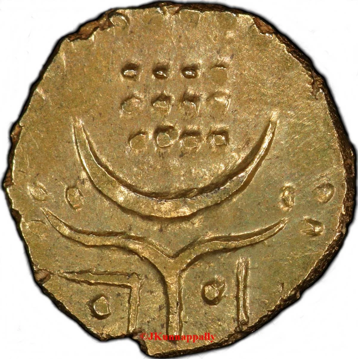 Design based on South Indian kaliyan fanams, featuring a chakram inside a crescent above Vishnu's feet, shown as two curved lines and ten toe pellets.