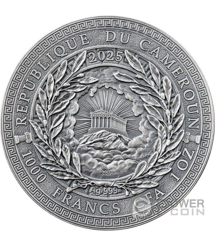 Olympus amid clouds, a laurel wreath, and Greek patterns.