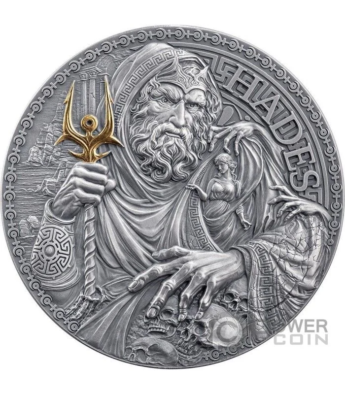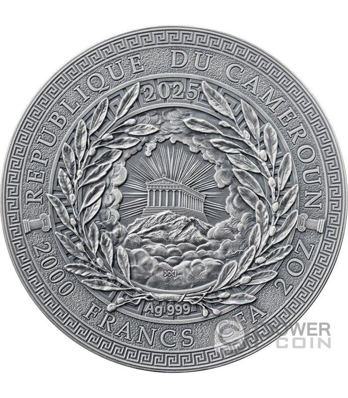 Olympus amid clouds, a laurel wreath, and Greek patterns.