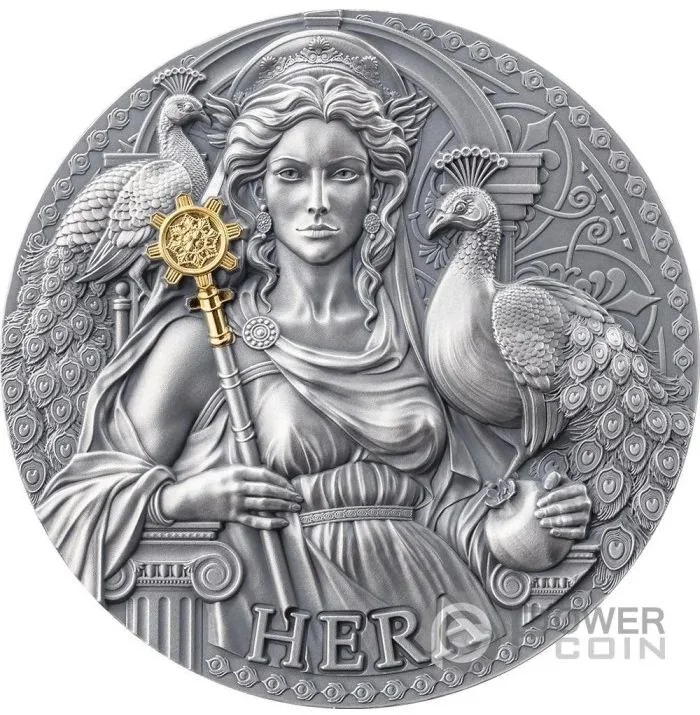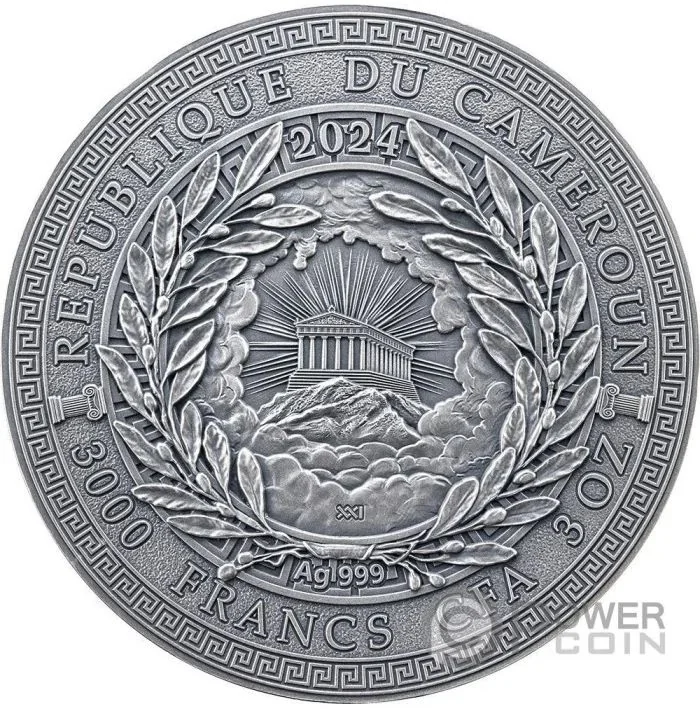 Olympus amid clouds, a laurel wreath, and Greek patterns.
