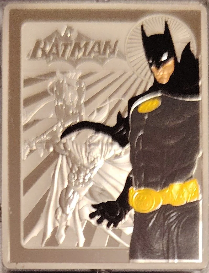 Batman de profil droit, avec deux autres Batman en arrière-plan, sur un fond rayonnant.