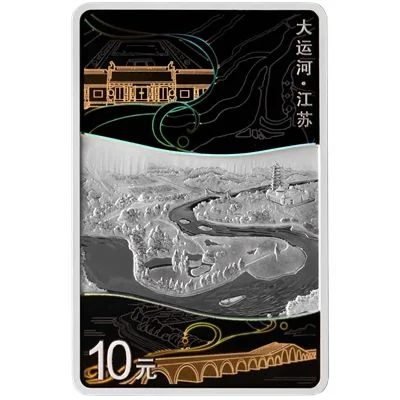 Jiangsu's Grand Canal sites: Sanwan section, Yangzhou's China Grand Canal Museum, Huai'an's ancient Grain Transport office, Hongze Lake Embankment, Suzhou's Baodai Bridge, and a historical map of the Qingkou water conservancy project.