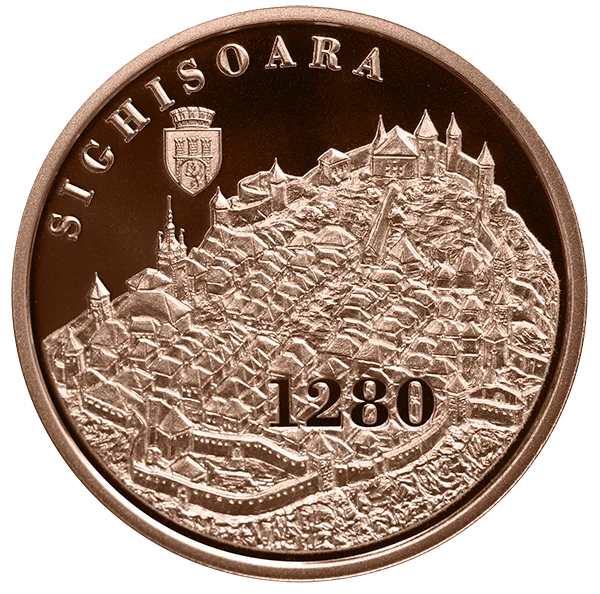 A graphic depiction of Sighișoara's fortress, its current coat of arms, and the inscriptions "SIGHISOARA" and "1280," the year of its first recorded mention.