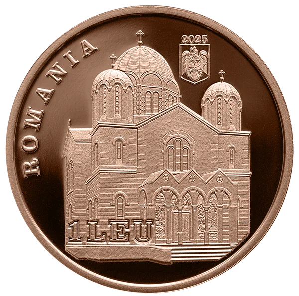 A vintage image of Gherla's Greek-Catholic Cathedral, with "ROMANIA" arched above, the year 2025, Romania's coat of arms, and the face value "1 LEU".