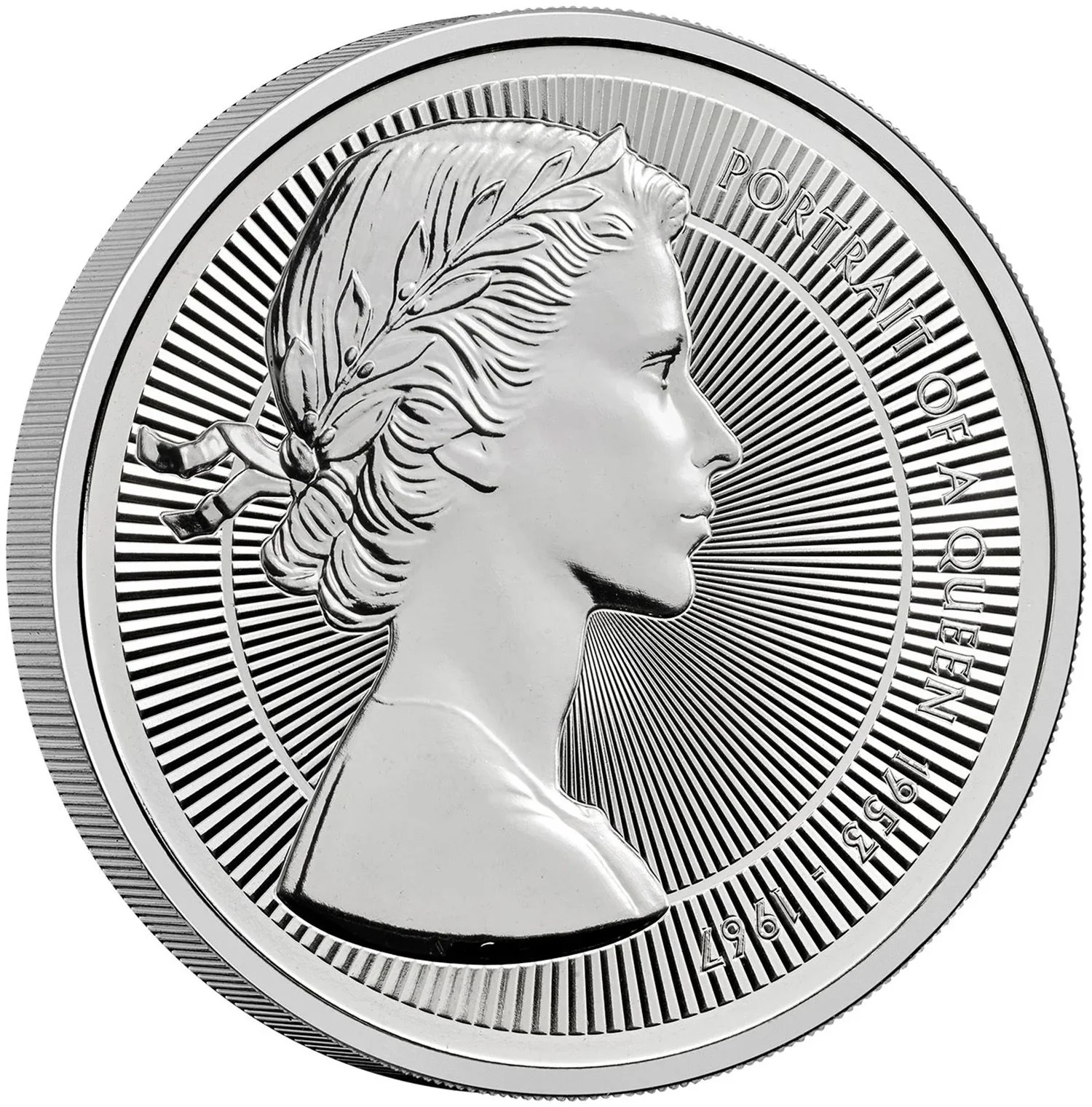 Young laureate portrait of Elizabeth II facing right.