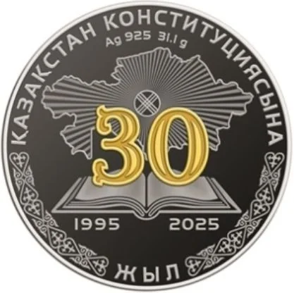 A map of Kazakhstan behind an open book, marked "30" and the years 1995-2025, represents the Constitution. Above is the inscription "ҚАЗАҚСТАН КОНСТИТУЦИЯСЫНА" with metal specifications; below are national ornaments.