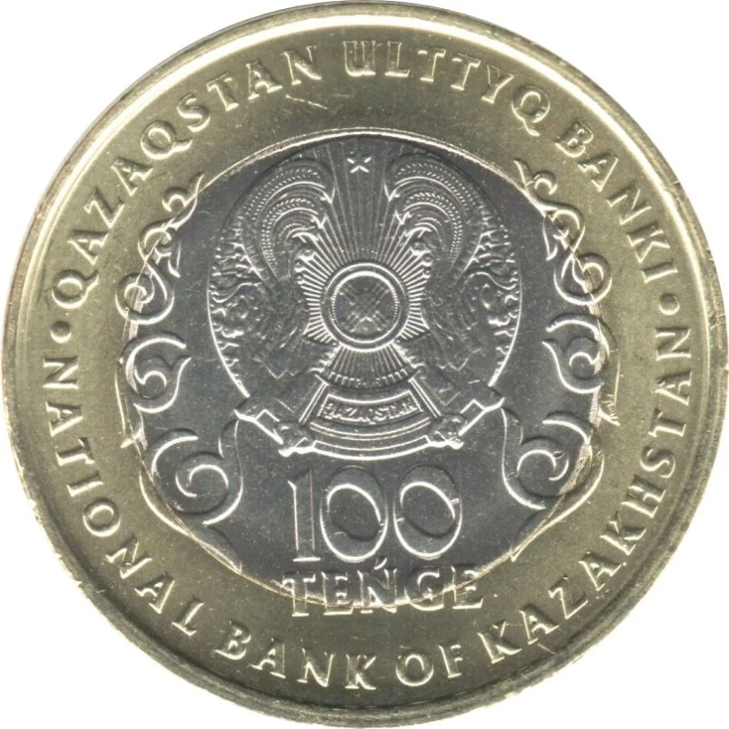 The central State Emblem is flanked by national ornament, encircled by "QAZAQSTAN ULTTYQ BANKI • NATIONAL BANK OF KAZAKHSTAN" and the denomination "100 TEŃGE" at the bottom.