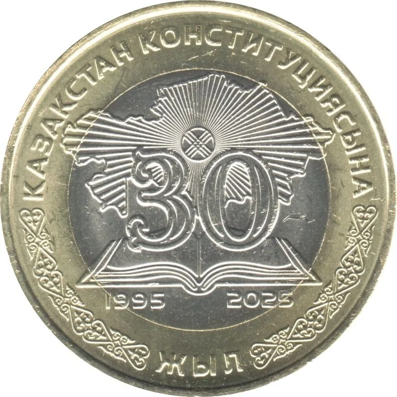 A map of Kazakhstan behind an open book, representing the Constitution, displays the number "30" and the years 1995-2025. The circle is inscribed with "ҚАЗАҚСТАН КОНСТИТУЦИЯСЫНА" above and national ornament below.